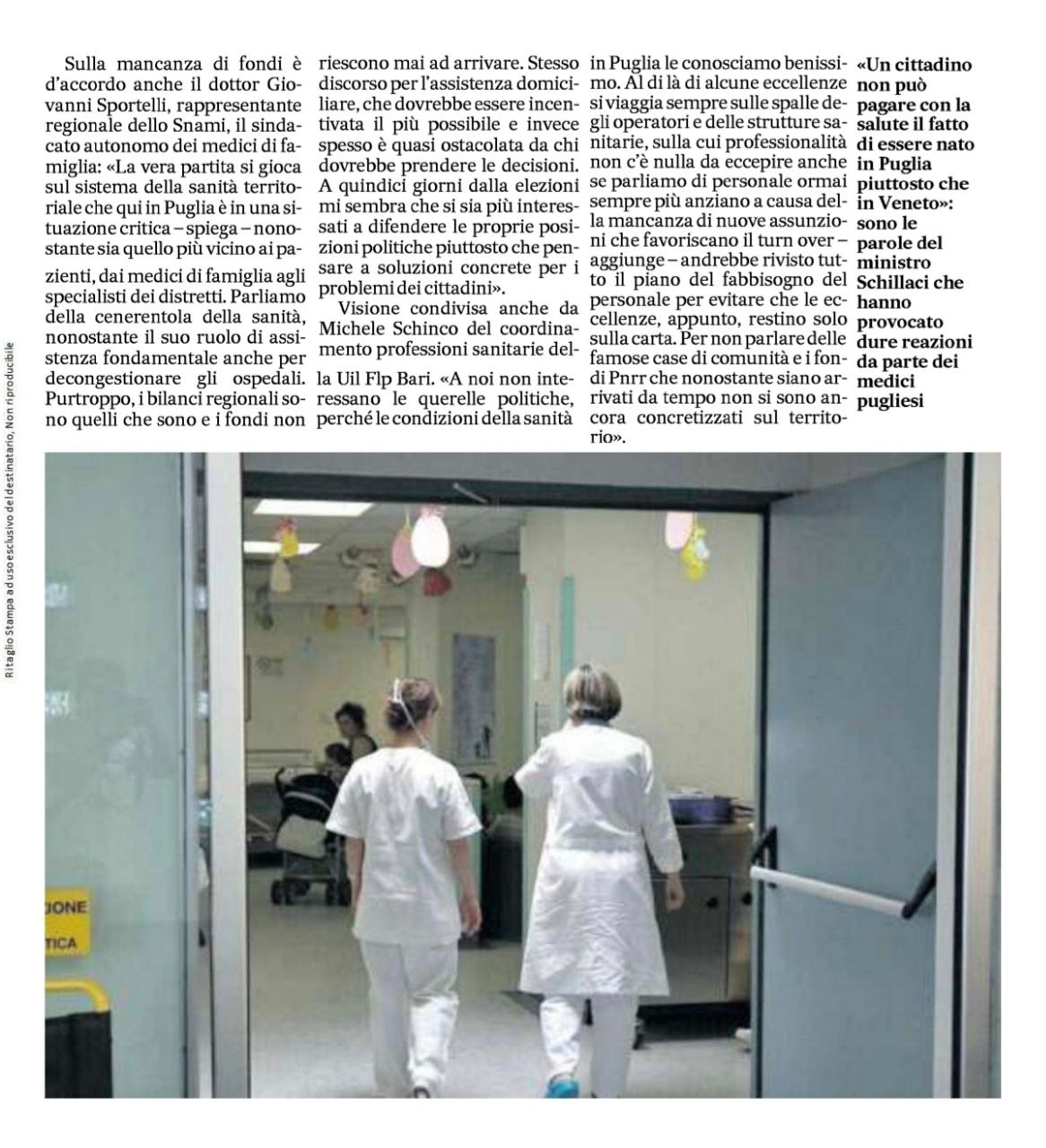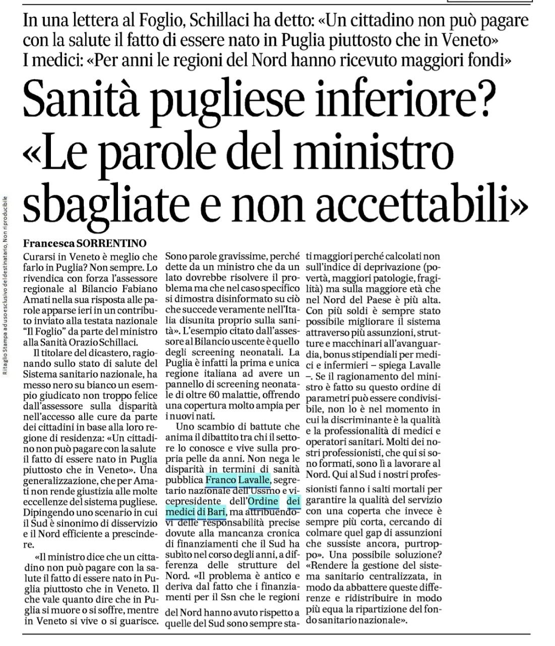 In una lettera al Foglio, Schillaci ha detto: «Un cittadino non può pagare con la salute il fatto di essere nato in Puglia piuttosto…