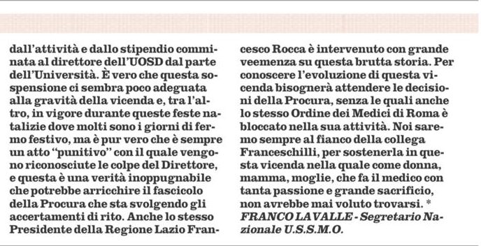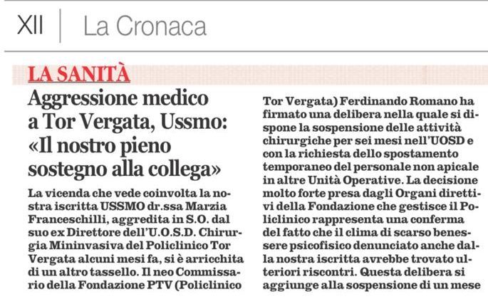 La vicenda che vede coinvolta la nostra iscritta USSMO dr.ssa Marzia Franceschilli, aggredita in S.O. dal suo ex Direttore dell’U.O.S.D. Chirurgia Mininvasiva del Policlinico Tor Vergata alcuni mesi fa, si è arricchita di un altro tassello. Il neo Commissario della Fondazione PTV (Policlinico…